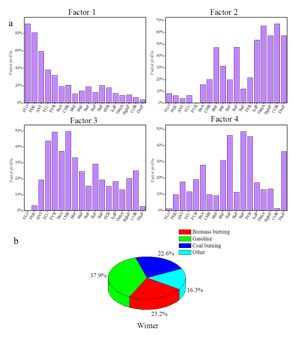 Sanya is a popular tourist destination where locates in the southernmost tip of Hainan Island, China. Very limited environmental monitoring has been done in Sanya, and even a lack of study on its carbonaceous PM2.5. This work here reports on the concentrations of organic carbon (OC) and elemental carbon (EC) in additional to the concentrations and compositions of selected non-polar organic species, including PAHs and n-alkanes, on the PM2.5 aerosols loaded filter samples collected in Sanya city in 2012 and 2013. The concentrations of these carbonaceous matters were generally higher in winter than summer. The estimated secondary organic carbon (OCsec) accounted for 38% and 54% of the total organic carbon (TOC) in winter and summer, respectively. The higher value of OCsec in additional to the presences of photochemically-produced PAHs in summer support that photochemical conversions of organics are much active at the higher air temperatures and with stronger intense solar radiation. Carbon preference index (CPI) and percent contribution of wax n-alkanes suggest that anthropogenic sources were more dominant than derivation from terrestrial plants in Sanya. Diagnostic ratios of atmospheric PAHs further indicate that there was a wide mix of pollution sources in winter while fossil fuel combustion was the most dominant in summer. Positive Matrix Factorization (PMF) analysis with 18 PAHs in the winter samples found that motor vehicle emissions and biomass burning were the two main pollution sources, contributing 37.5% and 24.6% of the total quantified PAHs, respectively (Fig. 1). Because of numbers of the sample collecting in summertime, the PMF analysis was not done in summer. The information acts as a complement to the current chemical database on national PM2.5 in China.